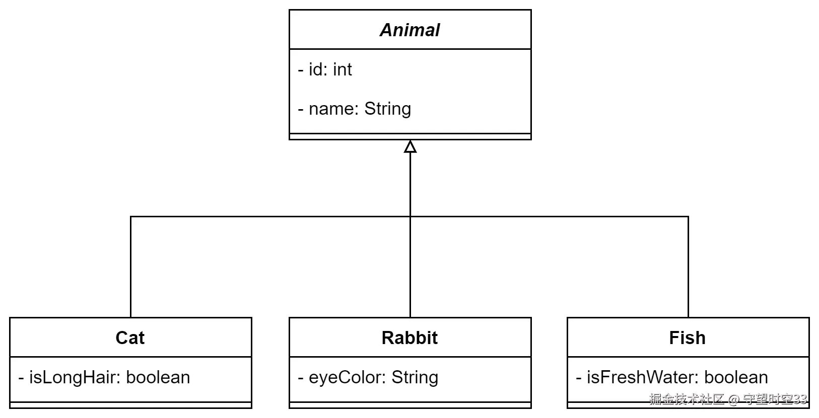 例如动物类是一个抽象类,它被具体的动物类型例如猫类、兔子类、鱼类等继承,则表示如下: