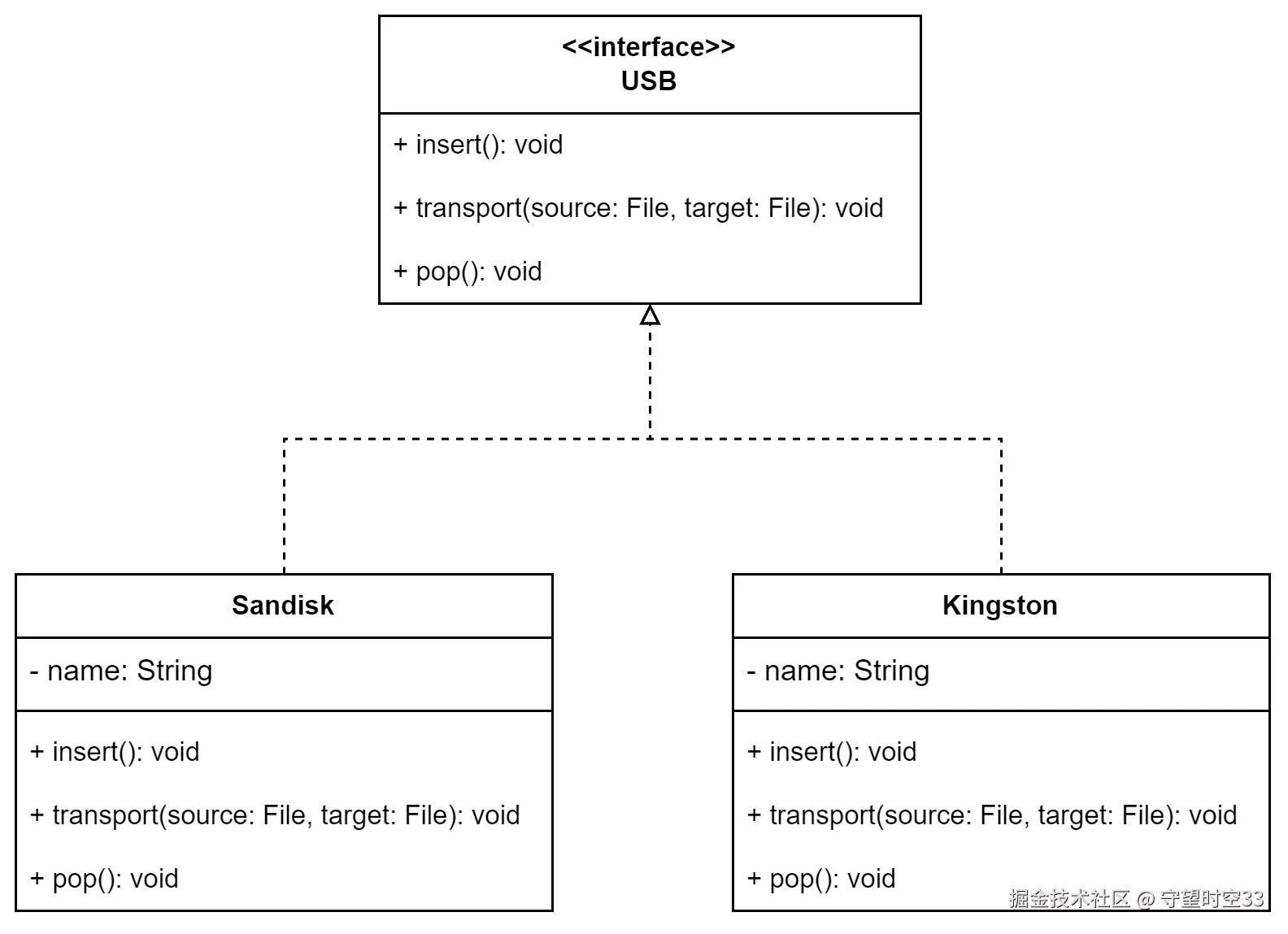 例如USB类是一个接口,定义了USB接口的抽象传输规范,而具体的U盘类型例如金士顿、闪迪等U盘类型实现了这个USB接口中的方法,则表示如下: