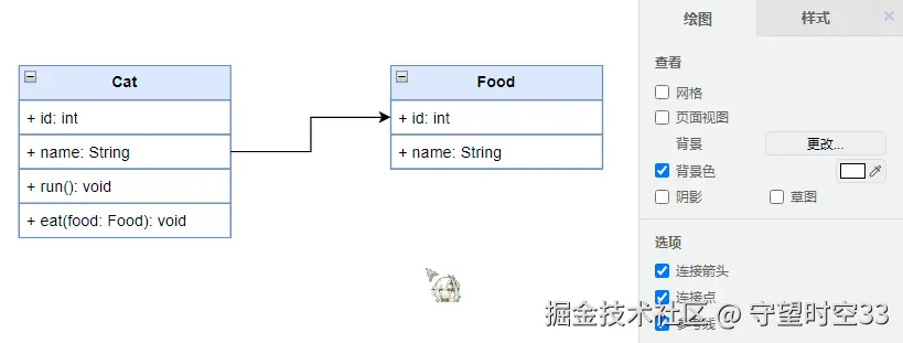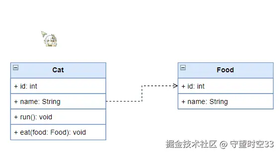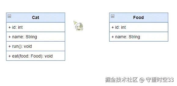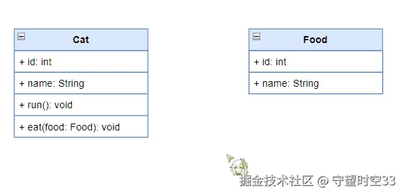 public class Cat { private int id; private String name; public void run() { // ... } public void eat(Food food) { // ... } }