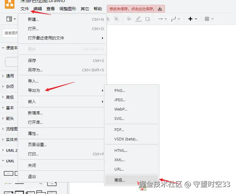 点击左上角文件 - 导出为 - 高级,即可导出为图片: