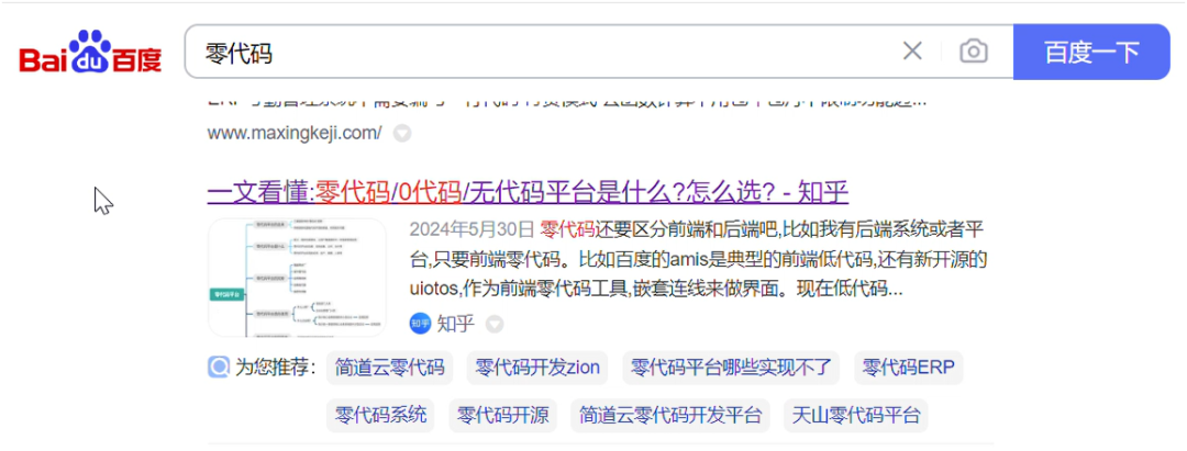 以我十几年实战经验,到一定收入规模的公司很少不投搜索广告的。帆软也不例外,搜索广告投放上,通过百度搜索简道云和零代码对应关键词,看到竞价排名都在投,搜索非品牌词的时候有专门的营销落地页,可以促进流量转化。