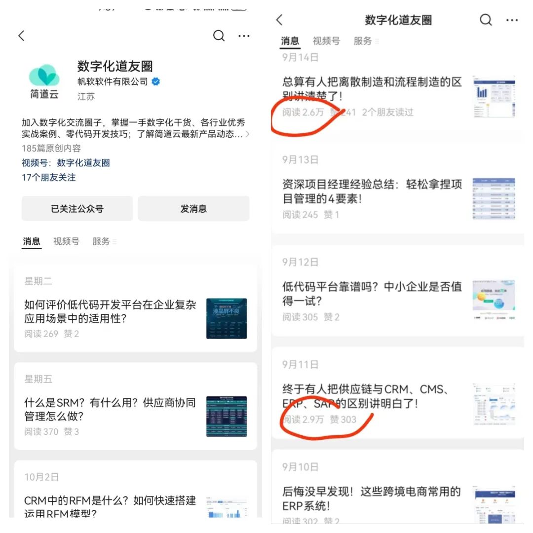 在新媒体营销上,简道云的微信公众号除了品牌号,还有两个营销号,可以借助公众号推荐流量获得客户。日常文章阅读量在几百,但是获得推荐和高转发文章阅读量能过万,能带来还算可观的线索。