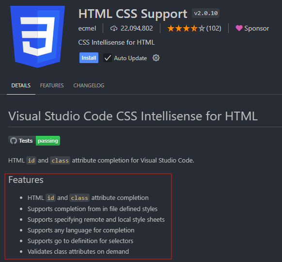 注册看 Feature 描述,它提供的功能,方便在 HTML 里调用 CSS。具体咱们后面使用的时候就知道了。 准备好了吧?只要依靠 HTML 的入门准备教程准备好了 VS Code 环境,又安装完了上面的扩展,准备工作就结束了。 明天咱们开始 CSS 的新旅程! 该文章在 2024/10/23 9:44:55 编辑过 |