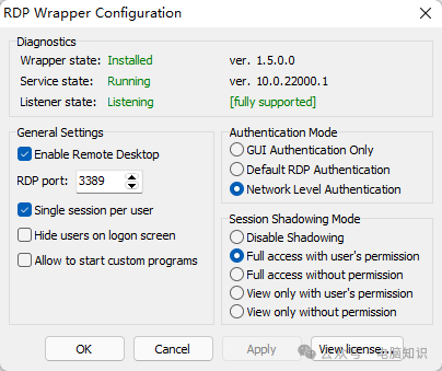 选择“RDPConf.exe”右键,选择“以管理员身份运行”查看相关信息,如下图则表示安装成功。在弹出的窗口中,你会看到RDP Wrapper的状态、配置信息和支持的远程桌面版本。如果看到“fully supported”和绿色的勾选标记,表示安装成功。