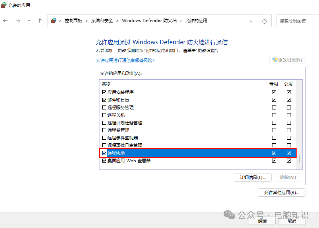 • 在弹出的窗口中,找到并勾选“远程桌面”或“远程协助”(取决于你的Windows版本),然后点击“确定”以保存设置。