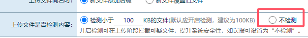 1、检查文件是否为黑名单文件类型,此处无法更改,不要上传该范围内文件; 2、关闭文件检测;