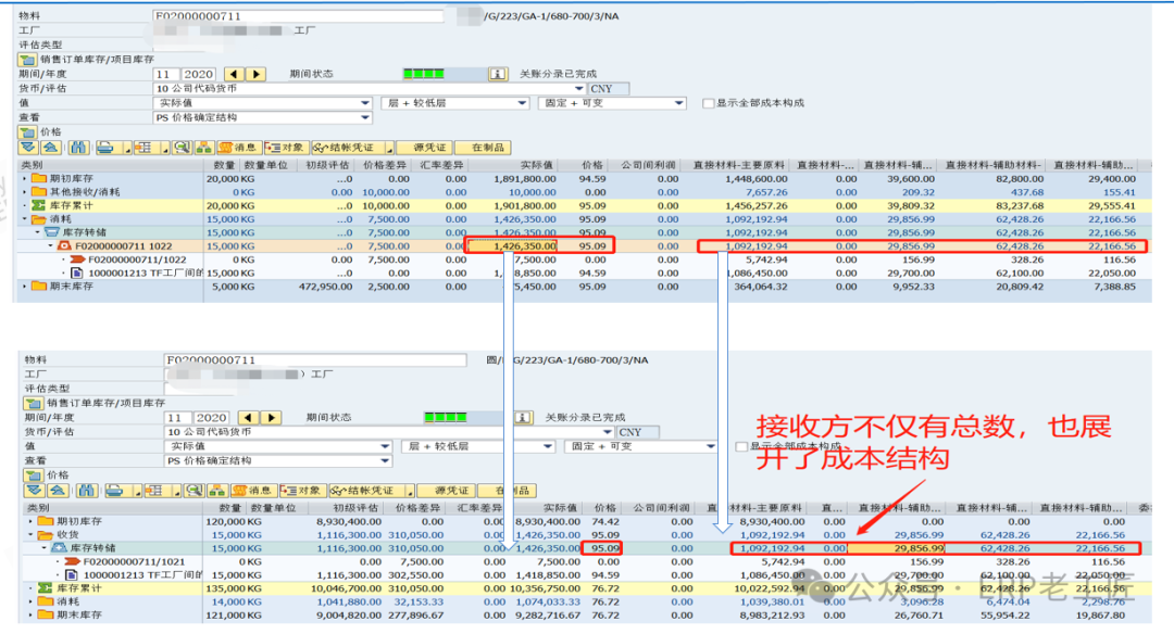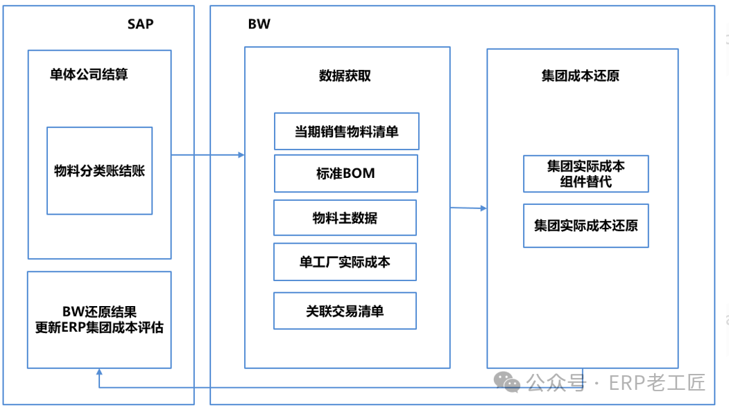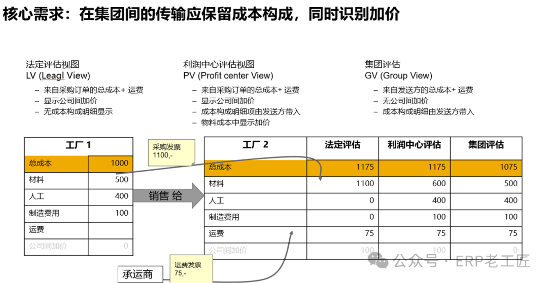概述:什么是成本还原, 为什么SAP项目中成本还原成为难点,成本还原在管理会计中的意义是什么? 成本还原(Cost Recovery),就是将产成品耗用各步骤半成品的综合成本,逐步分解还原为原来的成本项目。成本还原的方法是从最后步骤开始,将其耗用上步骤半成品的综合成本逐步分解,还原为原来的成本项目。 1.在业财一体化条件下,结账采用“综合结转”法,即上步骤的产品,是以综合成本总数结转到下步骤的,SAP的集成的实时过账,更加加剧了这个特点。 2.SAP系统计算实际成本的逻辑:实际成本=标准成本+差异,实际成本由标准成本及多笔差异结转而来,因此要实现完成的成本还原,必然对业务端操作有限制与要求. 3.特别是在集团型企业,跨公司存在着法定“加价”,增加了成本还原的难度,基于法定维度LV(Legal View)的法定存货评估与基于集团维度GV(Group View)背离,及大部分企业的数据基础薄弱,增加了实现成本还原落地的技术难度。 成本还原的管理价值:成本还原是基于集团价值链管理角度的概念,因此,对于整个集团的价值链分析,在预算管理,行业对标,内控分析等具有重要意义: 1)编制预算:基于集团层的预算,成本结构是重要的基础,比如原材料预算,辅助料预算,人工预算,设备预算等,成本还原结构是重要的参考数据,也是搭建很多BI数据分析模型的基础。 2)行业对标:与同行业对比,各种成本结构,各种资源消耗水平是否先进。法人结构可能由于税率等原因,各个公司有不同的设置,但是从管理的角度,相同的行业往往需要进行对标分析,比如汽车,手机,家电等。 3)全价值链分析,展开供应链合作,只有通过成本结构分析,发现价值有效还是无效,对供应链进行整合,比如,对某些成本高的工序进行外包决策等; 4)进行区域,行业等维度的战略分析:解析成本结构,区分交易加价,将集团,产品线,法定三个维度区分,区分各个产品,区域的获利能力。 方案总览:在SAP实施项目中,成本还原方案,按是否跨公司,基于实时交易(OLTP)或基于数据分析(OLAP),老工匠总结了3种解决方案: 方案一:单一公司代码下的成本还原: SAP系统中,激活实际成本构成本,按实际(成本结构)=标准(成本结构)+差异(成本结构),可实现标准成本结构VS实际成本结构,即实现成本还原: 1.只要激活物料账的实际成本结构标识,并释放标准成本,就可以实现按成本结构的标准VS实际对比分析,CKM3N标准功能,如左图所示; 2.实际成本结构=标准结构+差异,也就是说,差异是按结构的。 3.同一个工厂的,可以用标准功能实现,跨工厂的成本,也可以采用特别采购类型实现跨工厂的成本获取 跨工厂成本评估采用配置特别采购类型,并将此类型分配到物料主数据实现,如下图: 在同一个公司代码下,跨工厂转储可实现成本结构的结转,如下图是301转储样例,如下图: 方案2:跨公司,并采用基于交易凭证法 这就需要激活激活实际成本结构的同时,物料账平行评估(多重评估),区分与剔除公司间交易的加价,业务场景如下图所示: 集团成本评估功能使用前提(不完全统计): 1)集团评估仅限于单一控制范围下,如涉及到跨公司的成本核算,则关联的公司也应该在同一个控制范围 2)需要使用集团成本评估的物料主数据,价格策略必须是3+S 3)物料主数据需要执行多重评估:GV/PV/LV,如标估等 4)月末结账ML执行,需要所有的工厂一起执行:系统压力与风险。 5)工厂间的物料转储或公司间的物料转储,只能采用采用STO,不能采用PO+SO方式。 6)集团内委外加工无法还原 7)系统间的数据传递仅能通过ALE或EDI 要充分理解这些条件,包括对技术约束及数据约束!事实上,这些约束无论对技术,还是对技术,都是很高的标准,大部分的企业往往不具备这些条件! 平行评估的配置,请参考5.6讲,不在此赘述: 方案2的应用分享: 1.事实上,只有为数不多的企业应用集团评估,在这些企业中,真正应用较好,达到管理目标的也不多, 2.该方案仅适用于: a)管理基础较好,可以提供所有产品的标准价,且集团控制组织有明显的集团>按事业部>工厂>品类多级组织 b)应用技术成熟:用户操作,顾问技术,资源足够 c)集团跨生产方式有明显上下游关系,则还原的管理价值较大 3.如果采用方案对项目预算,周期,风险及资质要求,都是个很大的挑战,这需要从项目管理上进行充分的评估,行业内对集团评估技术应用全面的顾问资源紧缺。 4.不可逆:如果激活物料账的多重评估,并导入数据,系统自动更新相关的数据库表,是不可能通过修改配置,取消激活的。 方案3:跨公司,基于分析法: 由于跨公司交易在大部分情况下是有规则的,这种规则可以在BW&BI层面很实现,而不是象平行评估哪样,将分析数据推送到交易凭证中。 数据流与基本架构如下: 方案3的应用分享: 在项目中,方案3是比较现实的解决方案,与方案2比较,优势是很明显的:不再依赖复杂的多重评估凭证流---这意味着对业务操作及数据收集的极大简化,不同的企业行业也不尽相同,应用方案3时,以下几点供参考: 1 规范集团内的存货加价,不仅是法定交易的要求,对集团内的合并报表,成本管理意义重大; 2 不是为了成本还原还原成本,很多情况下,成本还原是基于分析,因此,通常通过集团内的价值链追踪,来实现成本分析,将成本还原与业务分析融合。 应用小结: 1.成本还原是重要的,但一般项目仍不建议采用方案2,主要不是基于技术原因,而是管理原因,或者是技术原因触发的对数据的