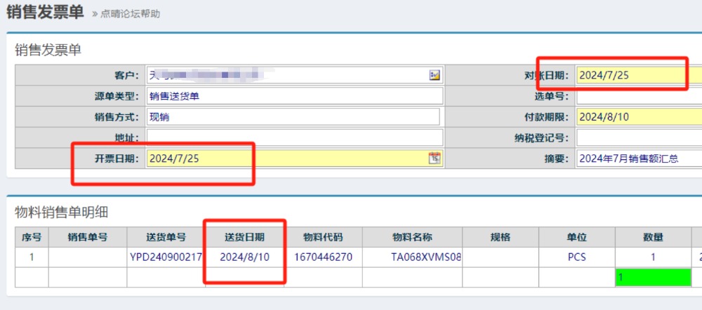 ![]() 情况描述:审核销售发票时弹出提示:送货日期晚于发票的月份,请检查发票! 如下图: 原因:送货单的送货日期晚于发票日期,理论:先送货后开票。 举个例子: 送货单的送货日期为8月,但开票日期为7月,此时就是悖论了。提示一下,不影响操作 如下图: ![]() 点晴模切ERP更多信息:http://moqie.clicksun.cn,联系电话:4001861886 该文章在 2024/10/25 11:15:15 编辑过 |