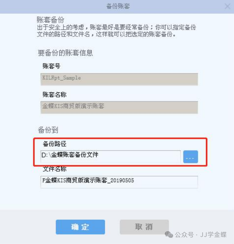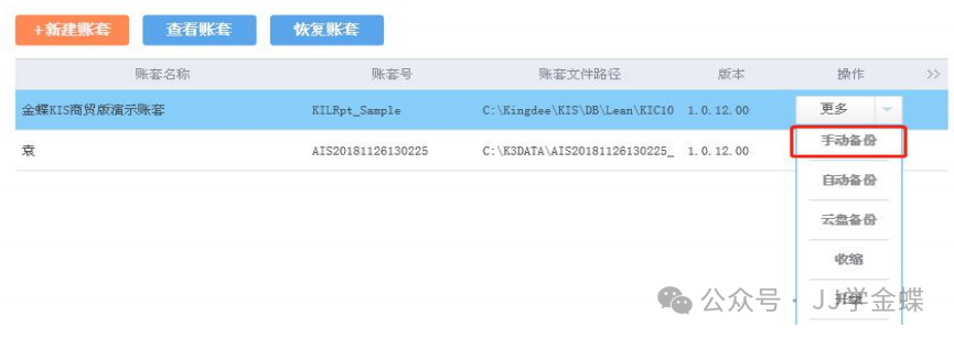 金蝶软件各版本备份操作流程: 1、金蝶KIS迷你版标准版备份账套: 软件主界面右上角【文件】 -【账套维护】-【账套备份】, 选择备份账套保存位置,建议勾上【备份到企业云盘】,点击【备份】按钮,这样在本地路径和金蝶企业云盘中同时进行备份。 2、金蝶KIS商贸版6.1及先前版本的账套备份: 开始-所有程序-金蝶KIS商贸版-工具-账套管理-备份-选备份路径-确定; 3、商贸版7.0及以后版本的账套备份: 服务器电脑右下角任务栏双击打开【金蝶KIS商贸版系统管理】-账套后面-更多-手动备份-选定备份路径-确定; 选择备份路径,点确定。 4、金蝶KIS专业版14.0及之前版本的账套备份: 1)开始-所有程序-金蝶KIS专业版-工具-账套管理; 2)录入账套管理密码,确定,没有设置密码的不用录入 3)点中需要备份的账套,点工具栏【备份】 4)指定好备份路径,录入备份文件名称,确定。 5、金蝶专业版14.1及以后版本的账套备份: 服务器电脑右下角任务栏双击打开【金蝶KIS专业版系统管理】-账套后面-更多-手动备份,如下图所示: 选择备份路径,命名备份文件名称,点【确定】。 其中V16.0功能做了优化,增加了图示功能: 6、金蝶KIS旗舰版的账套备份: 1)开始-所有程序-金蝶KIS旗舰版-金蝶KIS服务器配置工具-账套管理 2)录入账套管理密码,确定,没有设置密码的不用录入(V7.0出于安全考虑在综合补丁优化了这个功能,强制要求设置复杂性密码)。 3)点中需要备份的账套,点工具栏【备份】 4)选择完全备份和备份路径,录入备份文件名称,确定。