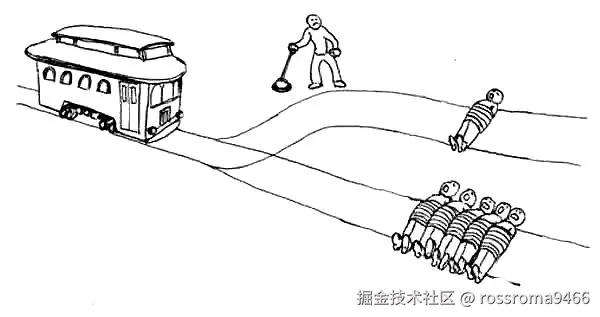 如图,当一辆电车快速驶来,无论图上的人采取哪种选择,似乎都是错误的。