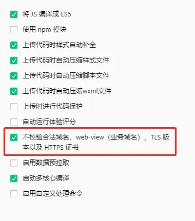 测试时,请确保勾选"不校验合法域名、web-view(业务域名)、TLS版本以及HTTPS证书"。
