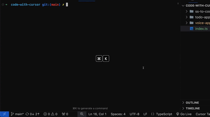 Cursor 的 AI 魔力不仅限于代码编辑器,它还延伸到了内置终端。在终端中,通过⌘ K快捷键,用户可以用自然语言表述操作需求,Cursor 能够精准转化为相应命令执行