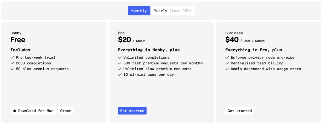 最后,来看看大家可能更关心的问题:Cursor 免费吗?目前,Cursor 提供了免费版本,不过功能有限,部分 AI 功能需要 高级版 (每月20$)和商业版(每月40$)才可以使用。