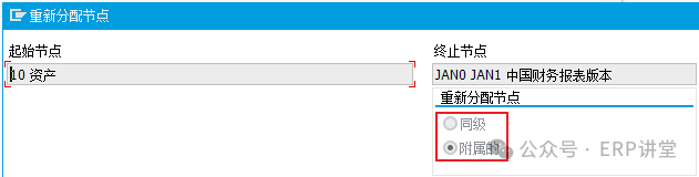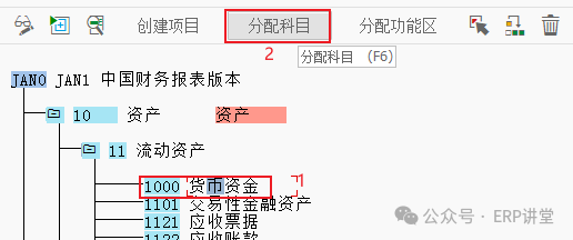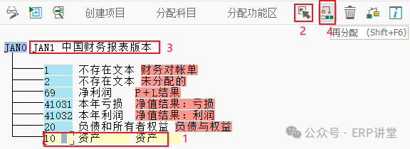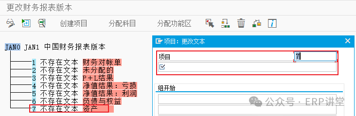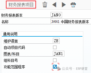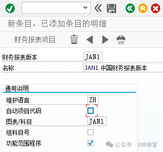 1.创建财务报表版本 IMG-财务会计-主数据-总账科目-财务报表结构-定义会计报表版本 1.1 新建报表版本: 点击“新建条目”创建财务报表版本; 自动项目代码:在编辑报表版本的时候,每一行的行项目号是否可以手工输入,如果选择该项,则不能手工输入; 图表/科目:每一个财务报表版本必须指定对应的会计科目表; 功能范围程序:如果启用功能范围,就必须选择该功能,表示在编辑报表版本的时候,可以根据功能范围取得数据; 1.2维护报表版本的表项: 点击“财务报表项目”维护对应的表项; 系统默认带出必须的表项 1.3 修改表项的项目号和描述 双击对应的行,可以更改项目编号和对应的描述; 1.4 调整表项的顺序 选中需要更改顺序的行,点击“选择”,再点击要分配到的行,再点击“再分配”可以调整行的顺序和分配关系;