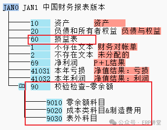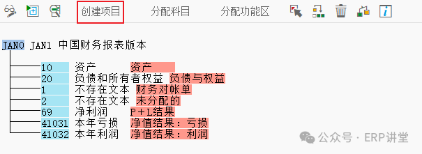 同级:和目标行在同一级别; 附属级别:在目标行的下一级别(属于目标行的子项); 1.5 新建表项 点击“创建项目”可以新建表项 60:损益表(新建损益表表项) 90:校验检查;检查表外科目和零余额科目月末的汇总余额是否为0; 零余额科目:固定资产清理,待处理财产损益; 成本类&制造费用:月末生产成本与制造费用的汇总余额必须是0; 表外科目:次级成本要素,GRIR,起初导入科目等;