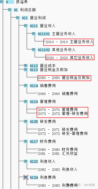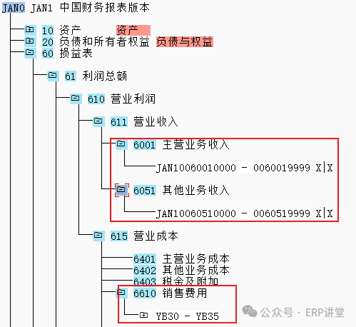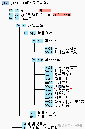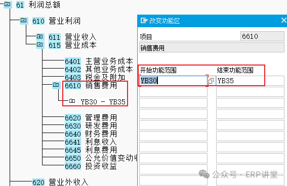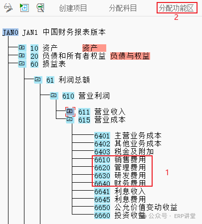 3.利润表的表项维护: 新建的表项需要和公司的利润表表项相同; 如果利润表是通过会计科目实现的,那利润表的每一个表项对应的都是会计科目; 如果利润表是通过功能范围实现的,那利润表的每一个表项对应的都是功能范围; 例如: 如果通过科目+功能范围实现,那利润表中部分表项对应了会计科目(除期间费用外的表项),部分表项对应功能范围(期间费用:管理费用,销售费用,财务费用,研发费用); 如果给表项分配功能范围,则选择要分配的表项,点击“分配功能区” 维护了功能范围,则该表项取数就根据维护的功能范围取对应的余额; 同一个表项功能范围和会计科目不能同时维护,只能维护一种类型;