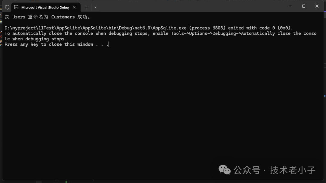 public static void RenameTable(SQLiteConnection connection, string oldTableName, string newTableName){    try    {        string sql = $"ALTER TABLE {oldTableName} RENAME TO {newTableName}";         using (SQLiteCommand command = new SQLiteCommand(sql, connection))        {            command.ExecuteNonQuery();        }        Console.WriteLine($"表 {oldTableName} 重命名为 {newTableName} 成功。");    }    catch (Exception ex)    {        Console.WriteLine($"重命名表时出错:{ex.Message}");    }}