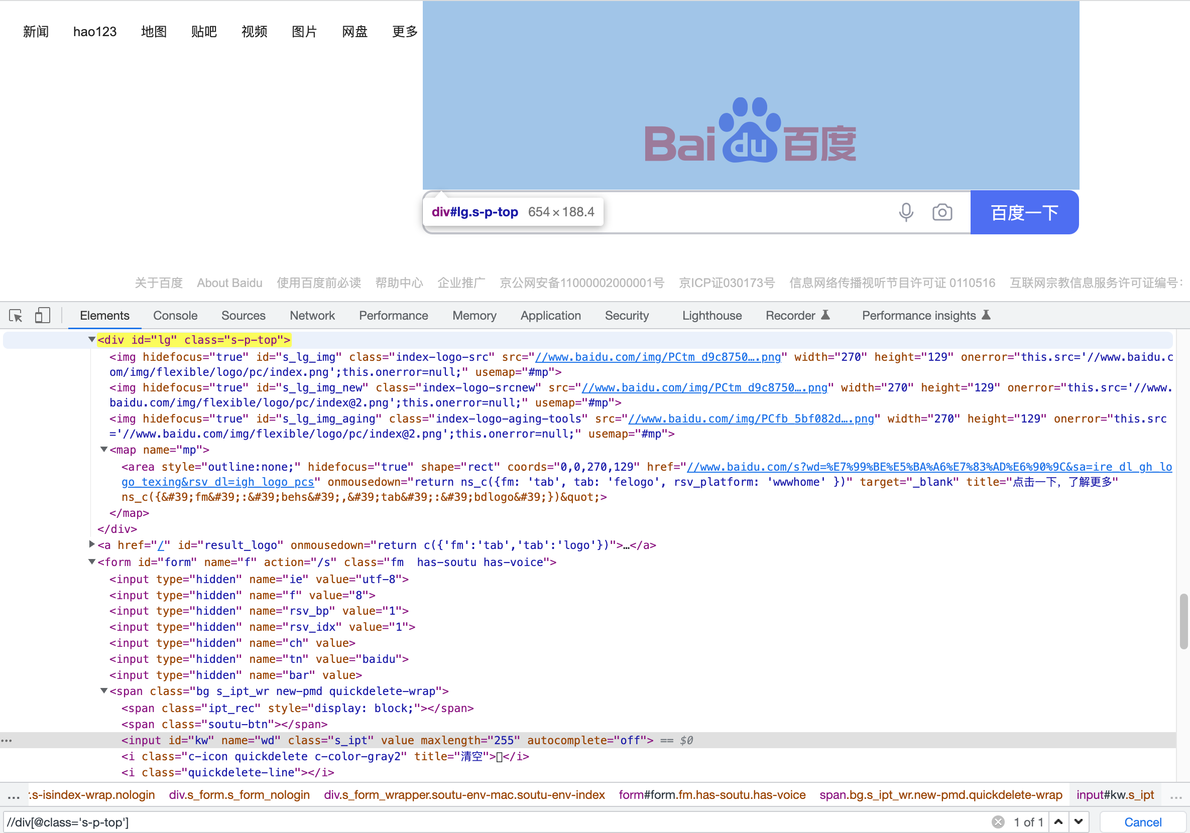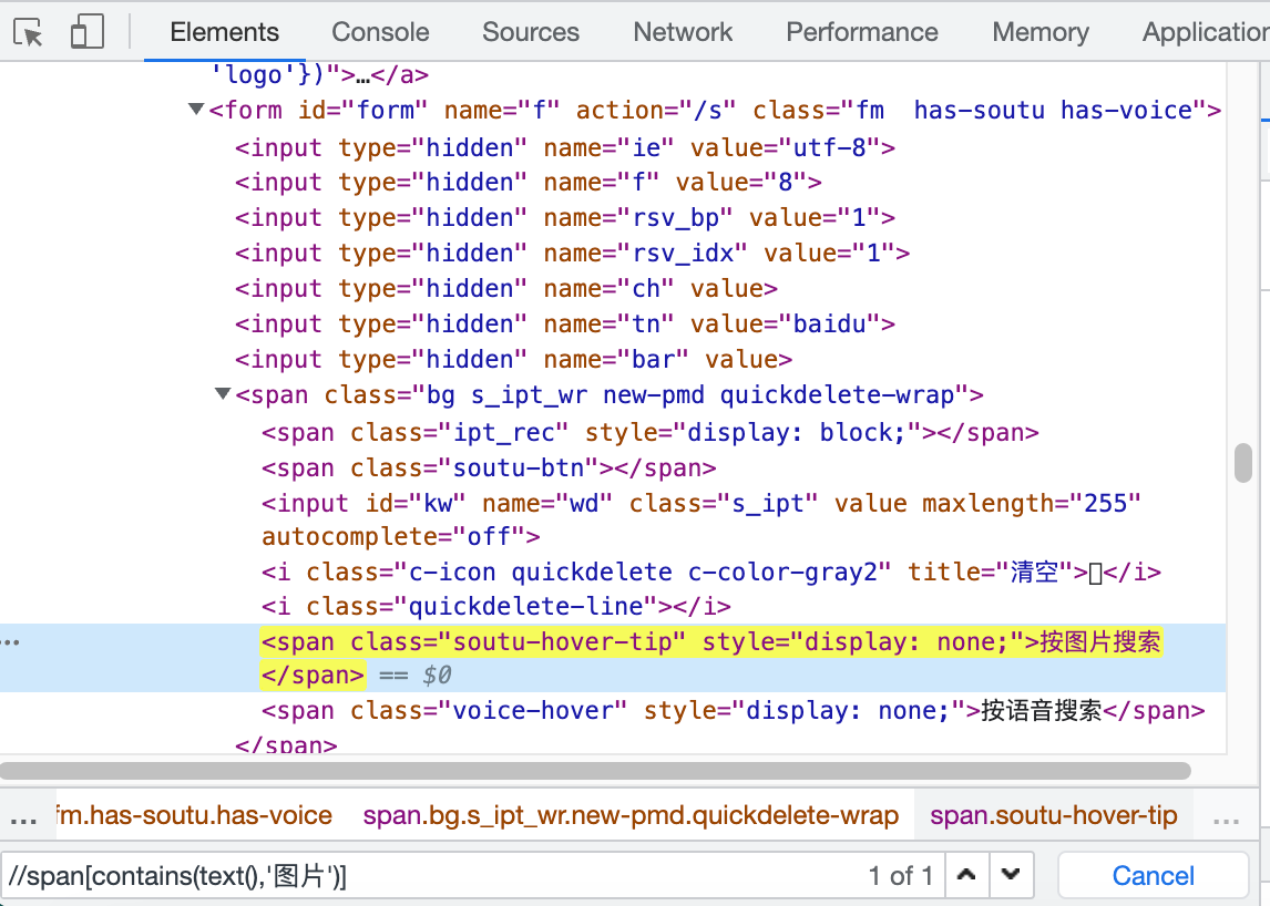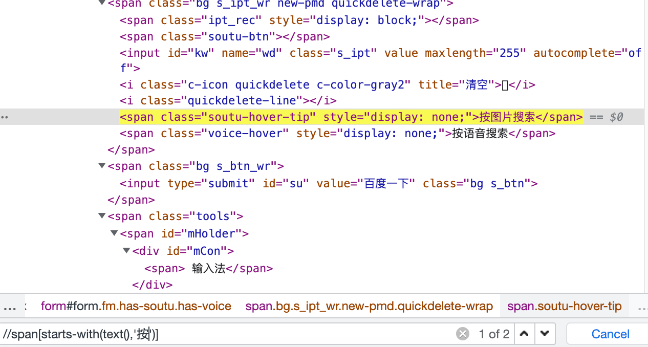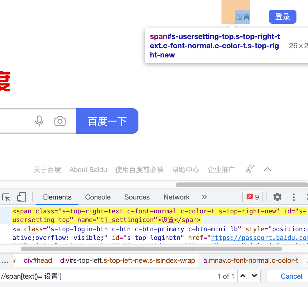 以百度页面为例,需要定位辅助模式,可以先定位到二维码,二维码是一个div元素,跟它同级的div在它的上方,所以用preceding-sibling::div