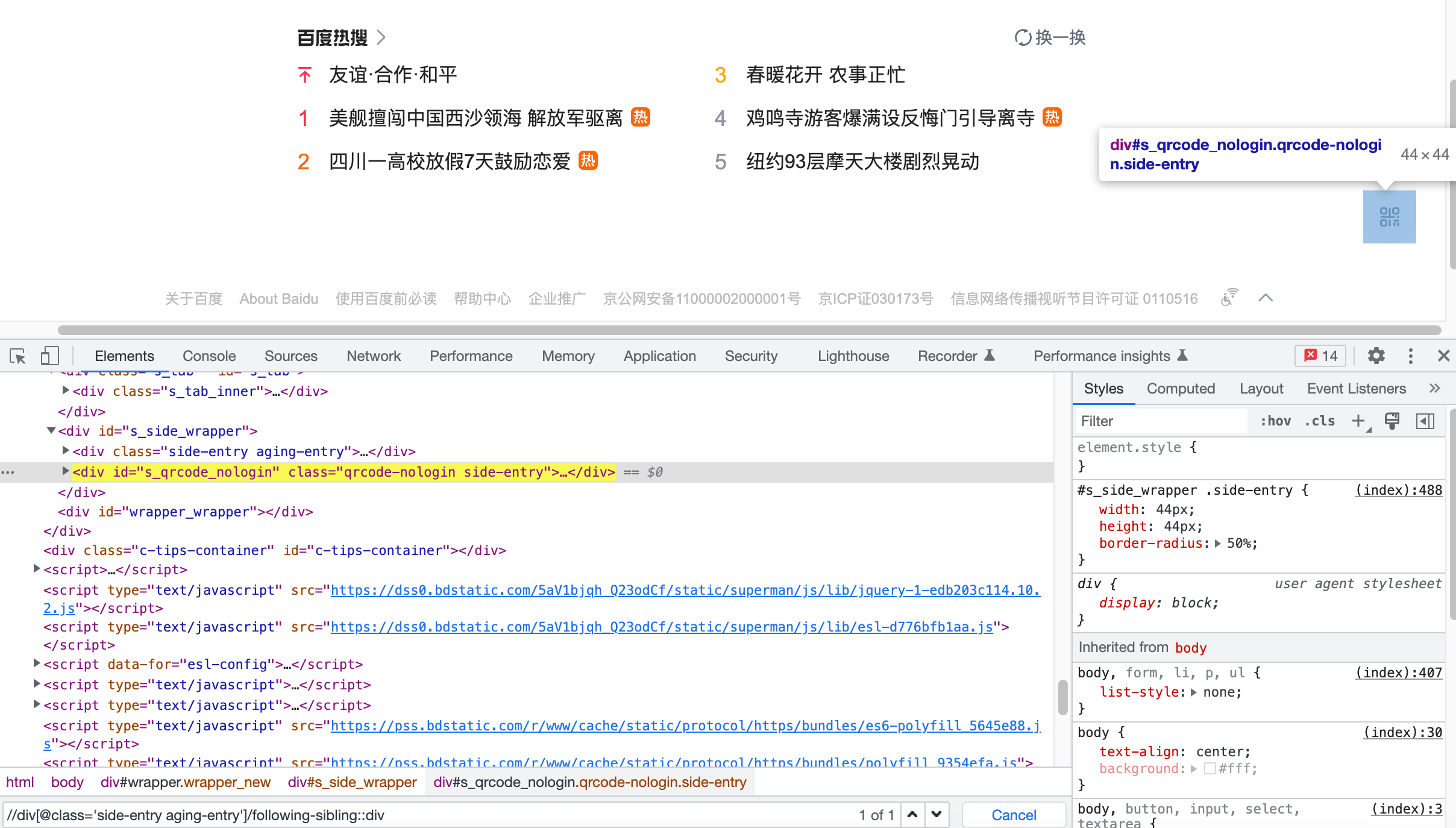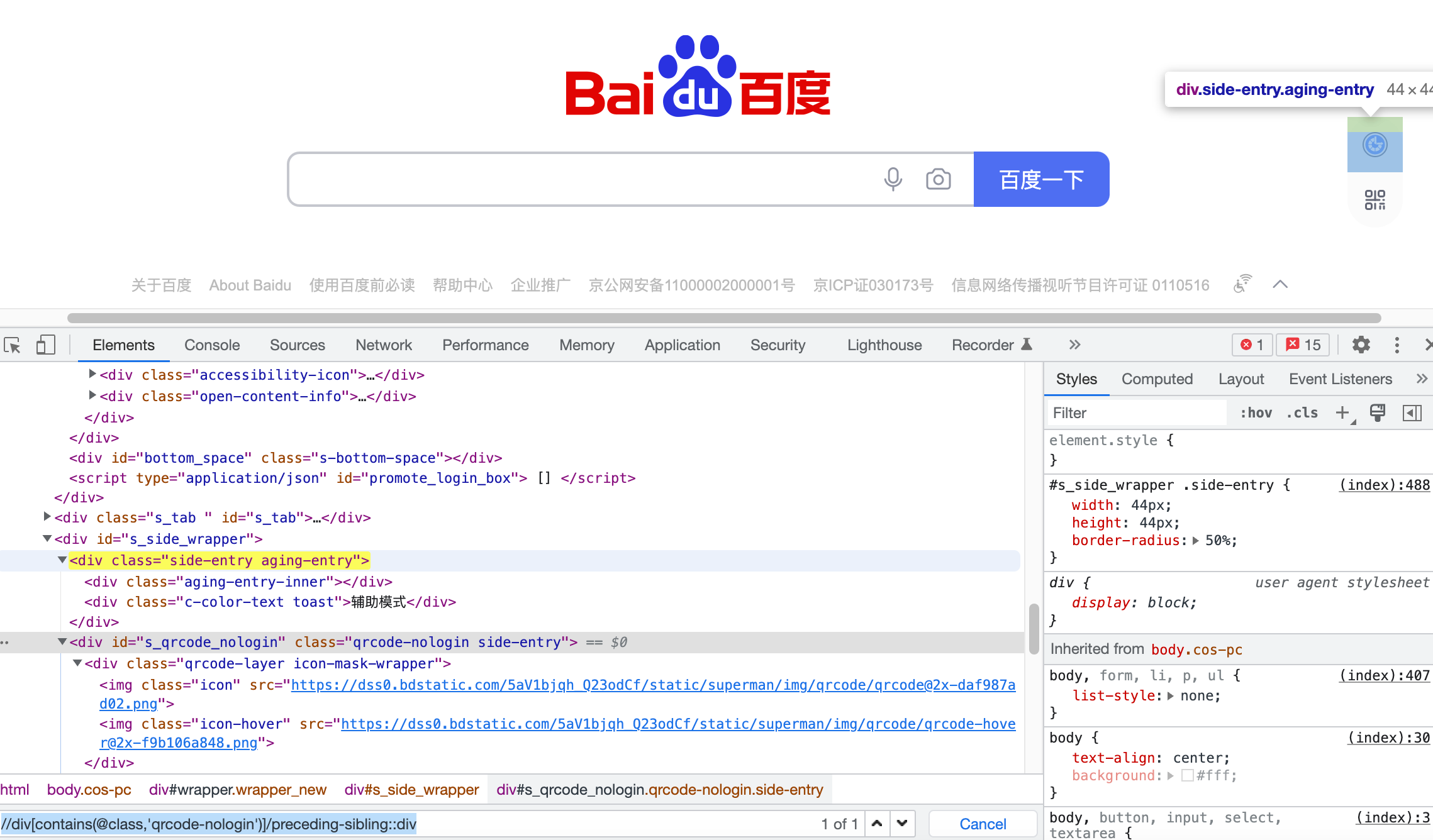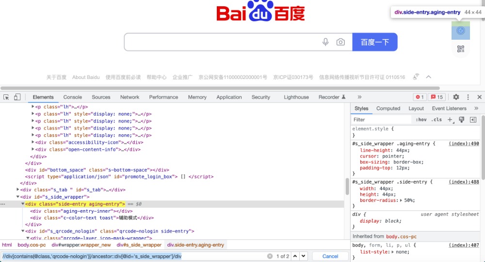 以百度页面为例,需要定位辅助模式,可以先定位到二维码,随后向上找到s_side_wrapper这个div标签,再往下定位找到辅助模式