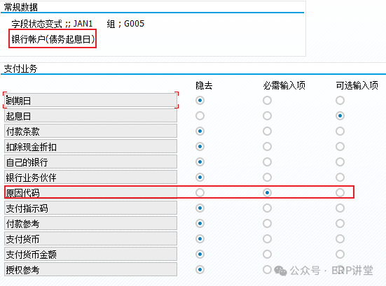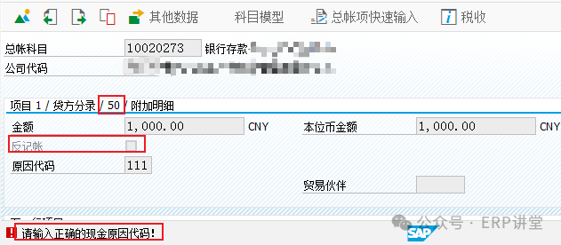 其他参数:维护附件的选择条件,一般在现金账户对应的其他参数中维护对应的原因代码;