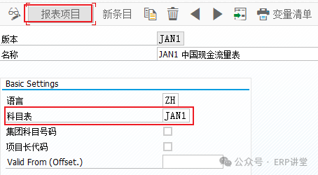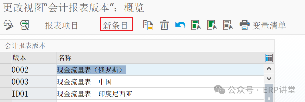 2.修改字段状态组 修改现金科目,银行存款,其他货币资金科目使用的字段状态组中原因代码为必输项目; 3.定义现金流报表版本(J3RFF4V) IMG-财务会计-总账会计-定期处理-报表-法定报表:中国-财务报表-现金流报表-定义现金流报表版本 点击“新条目”创建现金流量表版本: 科目表:如果在此指定科目表,那么定义会计报表版本时,仅可分配来自此科目表的科目,如果未指定科目表,那么定义会计报表版本时,可分配所有科目表的科目。 集团科目号码:当定义会计报表版本时,应分配组科目号而不是分配科目号。