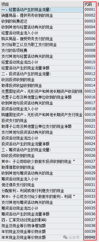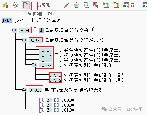 点击报表项目,新建现金流量表的表项: 点击“创建项目”和“分配账户”可以创建具体的表项和给表项分配科目; 需要注意每个表项前面的代码,现金流量表展示的时候就是按照每一个表项前面设置的代码顺序进行排序;