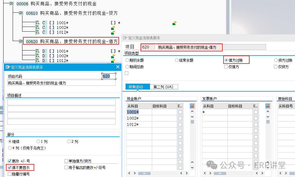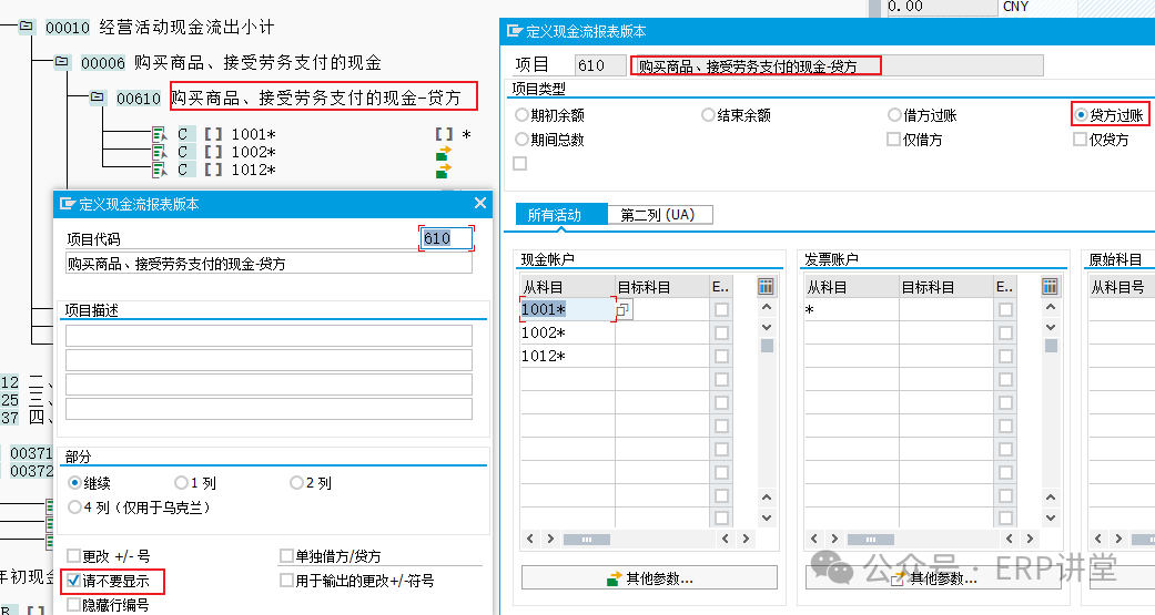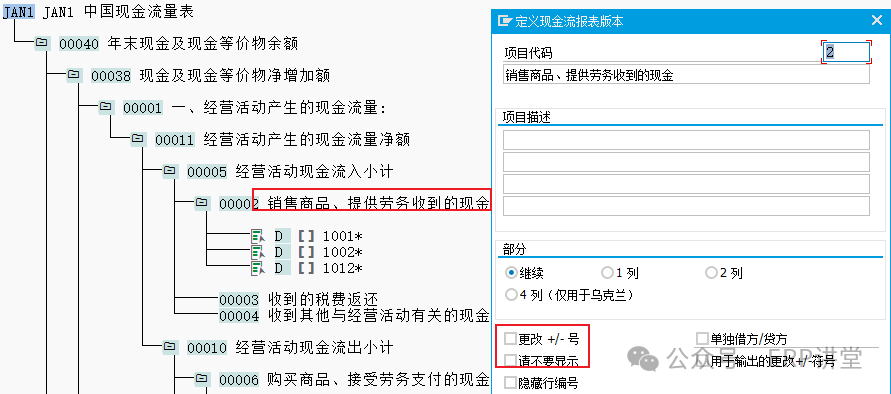 备注: 如下配置,“销售商品、提供劳务收到的现金”表项中配置的是取借方过账,正常业务中“销售商品、提供劳务收到的现金”对应的是收款,发生在借方,如果是退款那应该是冲销或者反记账; 但是如果退款用户没有使用冲销或者反记账,直接记账在贷方,那么这笔数据就回取不到; 针对如上的业务场景,一般有两种解决思路: ①通过系统增强(代码开发或者配置有效性检查):在凭证生成的时候,检查如果现金(银存,其他货币资金)科目出现在贷方时并且反记账为空时,不能输入现金流入相关的原因代码;从而规范业务的凭证录入; ②通过系统配置取到不规范的数据: 再每一个表项下设置两个辅助计算的表项-贷方取数,借方取数;该两个辅助表项选择不显示;