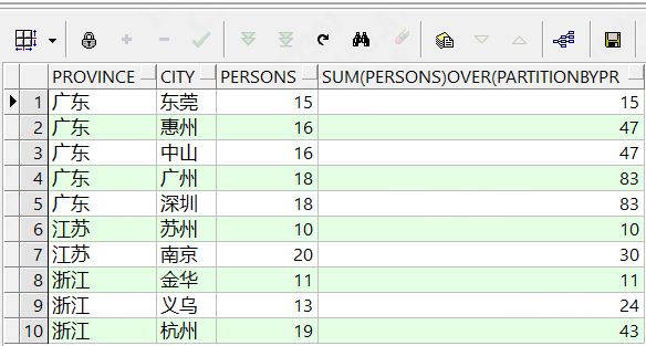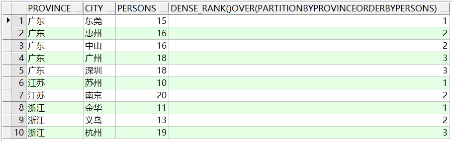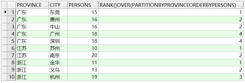 这个sql的作用就是根据province分组,并且分组后的每组的数据按照persons正序排序。 我们看到通过partition by分组后,select中是可以查出非分组的字段,这和group by是不一样的。 如果我们要查找每个省份人数最少的城市,可以用如下sql: