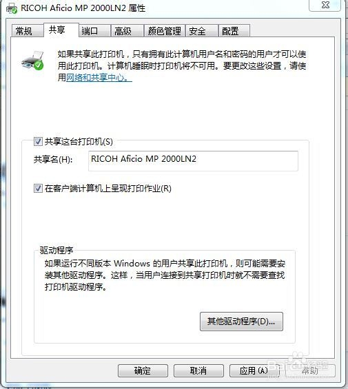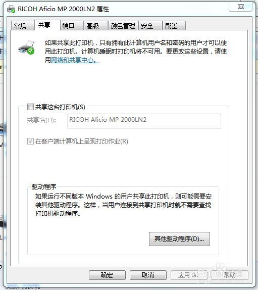 第三步:在属性中选择共享标签,在共享标签页面中,把共享这台打印机前面的勾取消掉就可以了。