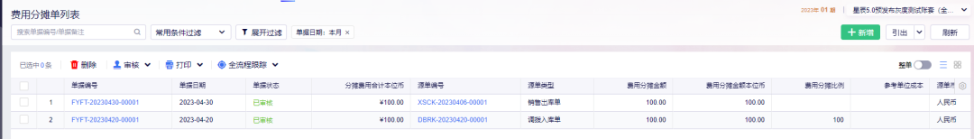 第二步,选择好费用单据和业务单据; 第三步,在费用分摊单主界面,可以看到待分摊的费用金额合计,点击“分摊费用”,系统会根据“分摊规则”中的选项将费用分摊到业务单据的“费用分摊金额本位币”字段中,也可以手工修改,点击保存,审核即可。 5.3 单据及报表的关联的字段在采购入库单中,增加了“关联采购费用”,用于记录通过费用分摊单分配的费用,用以区别同单“采购费用”分摊的费用。在销售出库单、组装单中,也增加了“关联销售费用”“关联组装费用”字段。 注意:旗舰版的采购入库单,销售发票,销售出库单均暂不支持同单费用 在销售类报表中,“计算毛利”公式中,“销售总费用”包括了同单分配的销售费用和关联销售费用 6、费用分摊单列表单击【库存管理】→【存货核算】→【费用分摊单】→【查询】,进入“费用分摊单列表”页面,用于汇总查看费用分摊单信息,可以对费用分摊单进行修改、删除、审核、打印等操作。如下图所示: 7、特别说明7.1 旗舰版专业版分摊单据对比由于旗舰版是单票分离的业务流程,以采购发票,销售发票立账,因此费用分摊单中,分摊单据类型与专业版稍有差异,同单关联费用功能也有差异,详情如下: