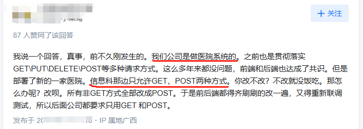 如果说上面一些网友只是在口嗨,那么这位网友,可谓是亲身经历,网友表示:“我们是做医院系统的,那边只允许用GET、POST两种方式。”,对此只能通过全部改请求方式,加班加点。