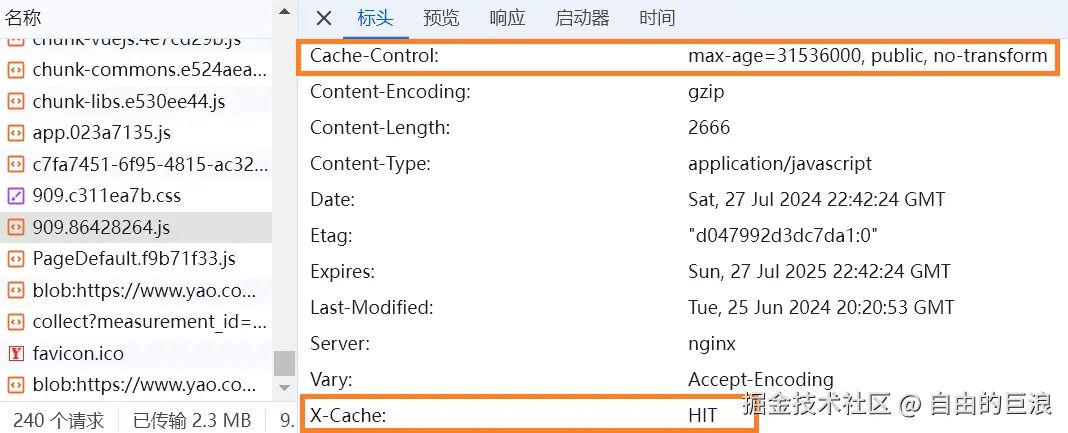 再看看 X-Cache 头,也就是 $upstream_cache_status 的值已经是 HIT 状态,表示该静态资源已经被代理缓存命中了。