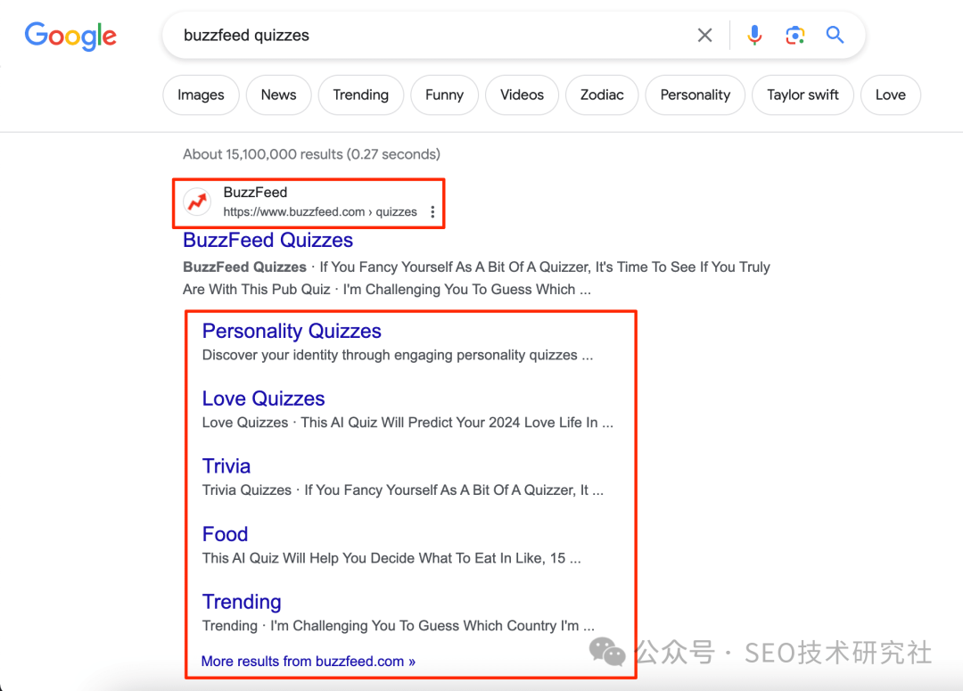 因此,如果你从 “Buzzfeed quizzes” 等查询开始搜索,你收到的搜索结果会将你引导至你感兴趣的网站类别。它还会将您指向一组具有不同子类别的站点链接和/或属于该类别的热门网页。