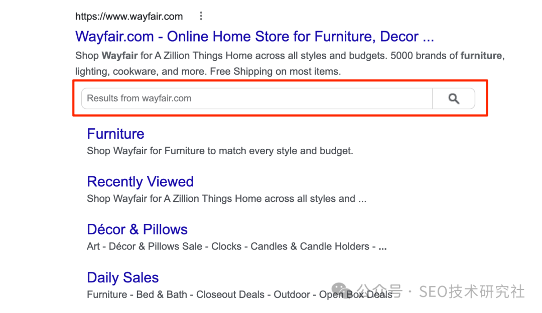 以下是有关 Wayfair 的搜索查询的搜索框如何显示的示例: