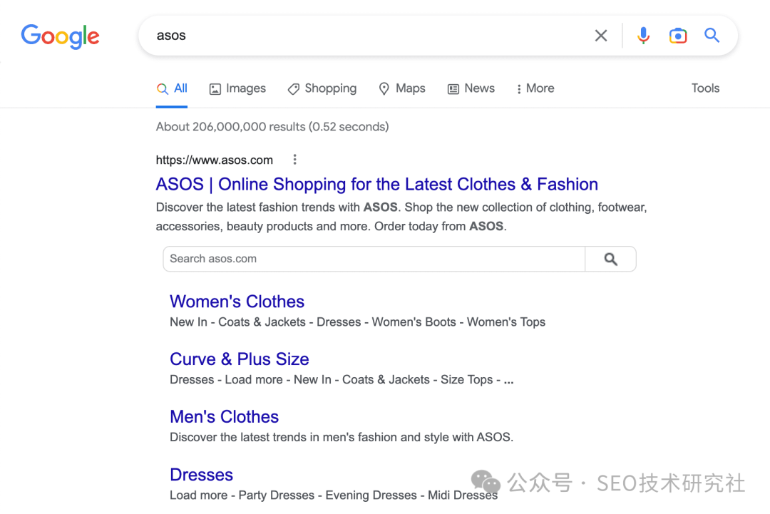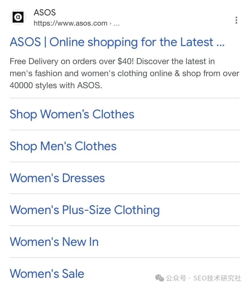 移动和桌面搜索结果上的 Google 附加链接并不相同。在移动设备上,与桌面版相比,在特定搜索结果下方看到的附加链接更多是很常见的,即使同一网站的桌面版摘要显示的附加链接较少也是如此。例如,下面的屏幕截图显示了 “asos” 查询的桌面搜索结果如何在主链接下包含 4 个附加链接。