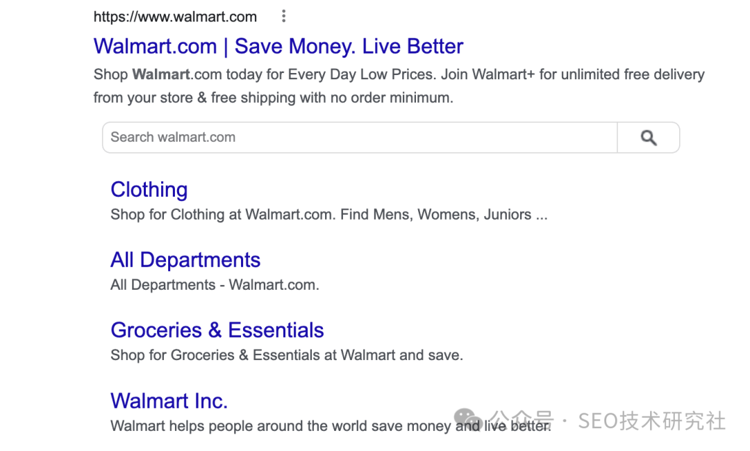 与桌面站内链接不同,移动端站内链接没有描述。例如,在下面的屏幕截图中查看 Walmart 的桌面搜索结果: