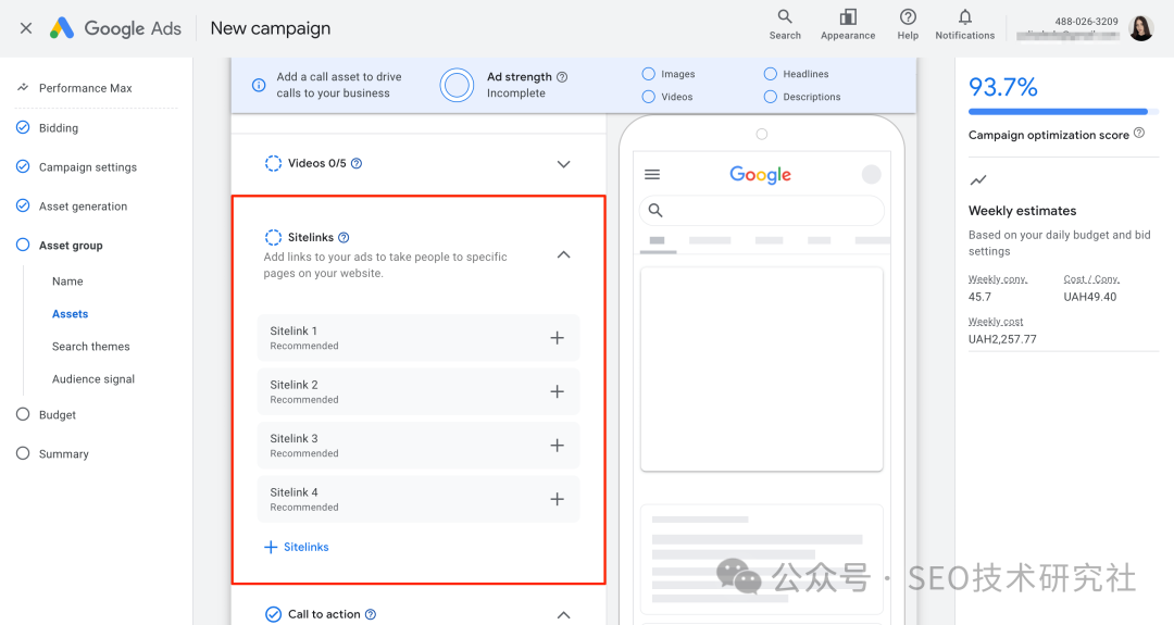 注意:2024 年 7 月,Google Ads 更新了效果最大化广告系列的界面。这些变化包括站点链接的新外观,采用编号格式。