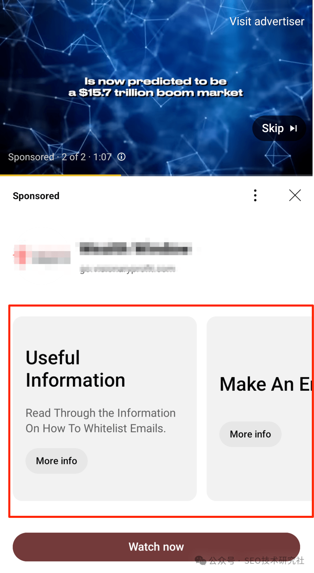 在视频广告系列中,付费附加链接最常包含在 YouTube 视频的开头、中间或结尾。要查看这些附加链接,用户需要展开兼容的广告: