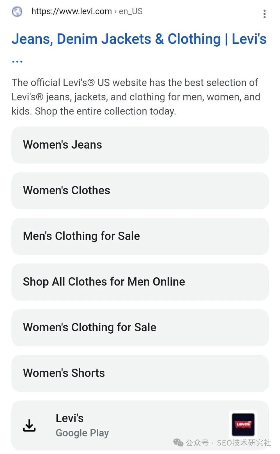 它的每个站点链接:服装所有部门杂货和必需品以及沃尔玛公司,都有一个简短的描述。在移动搜索版本中,同一 Web 结果的相同站点链接不会显示任何说明。