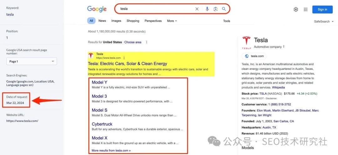 如您所见,谷歌向 Model X 网页添加了另一个附加链接。这可能表明该公司对 Model X 的兴趣越来越大,或者他们正试图提高其 SERP 对专门寻找该型号的用户的相关性。