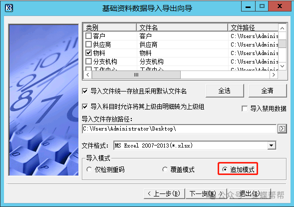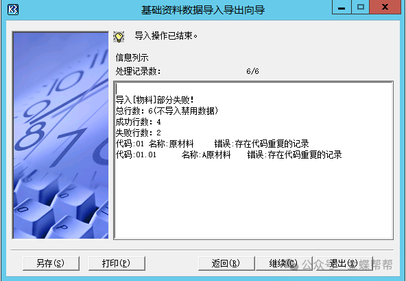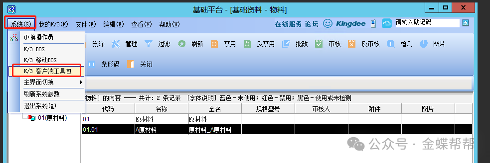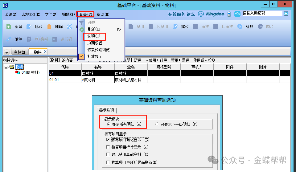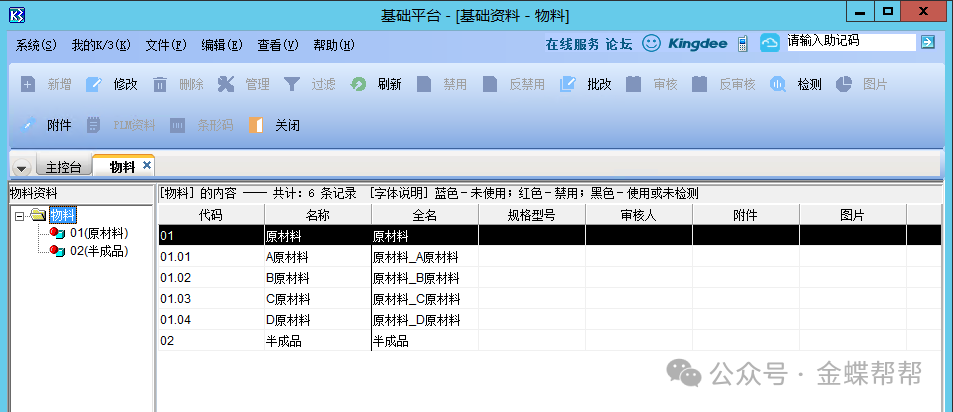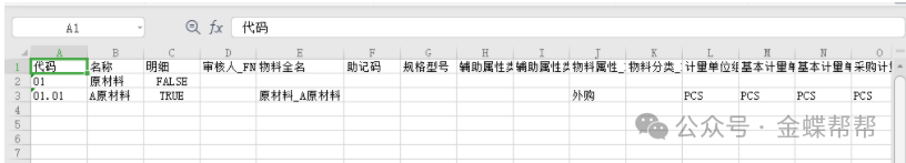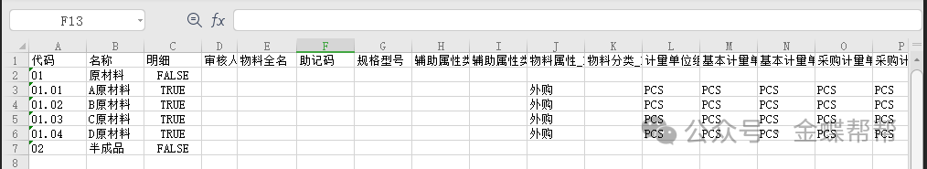 演示建立一个上级组:01 原材料,01.01 A原材料,系统默认只显示下一级明细,需要在“查看”——“选项”——勾选“显示所有明细”,即可显示为下图效果 3、第二步导出资料,通过系统——K/3客户端工具包——BOS平台——BOS数据交换平台——登录当前账套——选择基础资料新建任务——选择导出基础资料数据——选择“物料”——选择导出文件保存路径——选择执行——查看导出数据; 4、第三步整理资料,整理资料的意思就是在系统导出的模板上面增加需要导入的资料信息,系统导出的模板列项很多,整理时候只需要对变化的项目进行复制,不变动的值直接复制模板上面默认的,正常情况下要检查:代码(不能重复),名称,计量单位,明细(不要混淆,如图FALSE表示上级,TRUE表示明细),物料计价方法,存货科目,销售收入科目,销售成本科目物料属性(外购,自制,委外加工),演示部分在模板上面增加了3个明细物料(B、C、D原材料),1个上级组(半成品); 5、第四步导入资料,通过系统——K/3客户端工具包——BOS平台——BOS数据交换平台——登录当前账套——选择基础资料新建任务——选择导入基础资料数据——选择导入目标账套——选择“物料”——选择导入文件保存路径——选择导入模式(追加模式)——选择执行——查看导入日志;导入成功后进入系统物料界面进行查看核对 该文章在 2024/11/13 14:22:57 编辑过 |