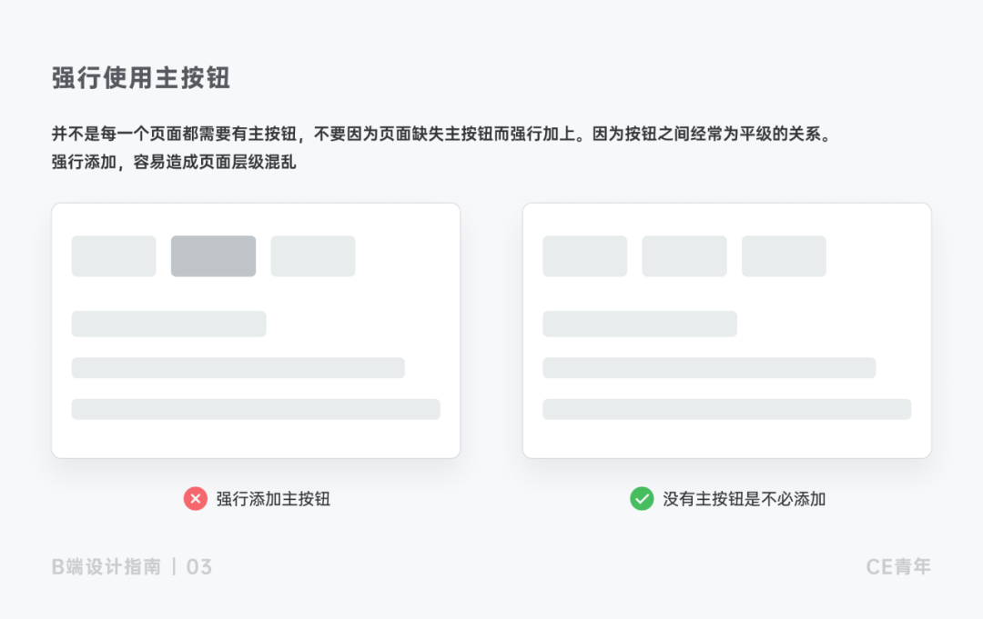 • 并不是每一个页面都需要有主按钮,不要因为源码缺失主按钮而强行加上。因为在实际使用中,时常遇到按钮之间为平级的关系,强行添加,容易造成页面层级混乱。
