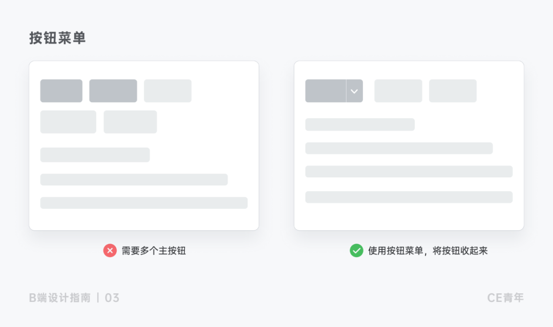 按钮菜单为设计中许多操作的集合,通常是将高频的操作以及一些低频的操作进行整合,组成的按钮菜单。这样既能够减少页面元素的冗杂,同时也能够满足业务对于功能的需求。