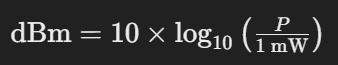 2.电磁波的功率单位在信号处理中, 功率分为绝对功率和相对功率,绝对功率用 dBm 表示,相对功率用 dB 表示 绝对功率单位 (dBm) dBm 是一个绝对单位,用于表示功率相对于 1 毫瓦 (mW) 的水平,当功率是 1 mW 时,功率为 0 dBm。它们之间的关系式: ![]() 常用的一些关系值如下表: