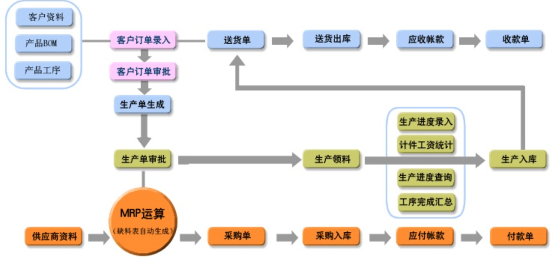 制造业ERP的五大生产模式有哪些? 按订单装配(ATO)、按库存生产(MTS)、按订单生产(MTO)、按订单设计(ETO)和按订单配置(CTO)。 按订单装配ATO 模式 企业在接到客户订单后才进行成品装配,产品的零部件具有标准化特征,但成品配置可根据客户需求定制。 在 ATO 模式中,产品的零部件标准化为企业带来了一定的稳定性和可预测性。这些标准化的零部件可以来自企业自身生产,也可以从供应商处采购,确保了在接到客户订单后能够迅速进行组装。 为了满足不同客户的需求,企业需要具备灵活的生产流程和技术能力,能够快速准确地将各种零部件组装成符合客户要求的成品。 客户需求的难以预测性是ATO模式的一个重要特点。 客户通常会明确提出特定的配置要求,这就要求企业具备快速响应的能力,生产过程由销售订单和生产任务单触发,确保生产及时性。 为了缩短交货期,企业需要保持一定数量的零部件库存,但如果库存管理不善,可能会导致库存积压或缺货的情况发生。企业需要合理控制库存水平,降低库存成本。既需要满足客户的时间要求,又要保证生产的质量和效率。 按库存生产(MTS)模式 MTS 模式一般是提前生产标准产品并存入仓库,接到客户订单后直接发货。该模式对企业的预测能力和库存管理能力要求很高,不准确的预测可能导致库存积压或缺货。 产品标准化让企业可以根据市场需求的预测大规模生产,从而提高生产效率,降低单位产品的生产成本。 这种生产模式对企业的预测能力和库存管理能力要求极高。如果预测不准确,可能会导致库存积压或缺货的情况发生。 库存积压会占用企业大量的资金,增加库存成本,同时还可能面临产品积压或过时的风险;而缺货又会影响客户满意度,导致客户流失。 市场竞争激烈,交货时间极短,企业必须保持一定的库存水平,以便能够在接到客户订单后迅速发货。 按订单生产(MTO)模式 企业在接到客户订单后才开始生产。此模式是 ATO 和 MTS 的补充,适合小规模生产,客户需求难以预测是MTO模式的一个重要挑战。客户的定制需求可能因个人喜好、使用场景等因素而各不相同,这给企业的生产计划和供应链管理带来了很大的不确定性,对供应链组织能力和协同管理要求较高。 客户下单后,企业才开始采购原材料、安排生产计划。 比如,一家定制家具企业,接到客户的订单后,根据客户的需求设计家具,然后采购所需的木材、五金等原材料,最后进行生产和装配。 这种生产模式的优点是能够满足客户的个性化需求,减少库存积压。因为是根据订单进行生产,所以不会出现生产过多产品而导致库存积压的情况。 缺点是生产周期较长,对生产计划和调度的要求较高。由于每个订单的需求都可能不同,需要合理安排生产计划,确保按时交付订单。 按订单设计(ETO)模式 针对高度复杂的定制化生产项目,企业接到订单后需从设计阶段开始,计划、买料、生产、到交付。产品为非标产品,生产加工和装配工艺极为复杂,成本价值高。每个订单都有独特的设计要求,对供应链协同管理要求极高。 非标机械设备生产企业是MTO模式的典型代表。客户会根据自己的生产工艺和需求定制加工设备。企业在接到订单后,需要进行详细的技术分析和研发设计,采购原材料进行生产。在生产过程中,需要涉及到复杂的加工工艺和装配调试。 客户的需求难以预测,企业需要具备强大的供应链组织能力和协同管理能力,以确保原材料的及时供应和生产的顺利进行,需要敏捷响应客户的需求变化和技术要求的调整。 同时,成本控制需要单独规划,每个订单的成本构成不同,包含设计费用、材料成本、人工成本等。企业需要精确计算每个项目的成本,以确保在满足客户需求的同时实现盈利。 按订单配置(CTO)模式 CTO模式是在ATO模式基础上衍生出的可实现更短交期的生产方式,利用标准化组件,对产品进行模块化、参数化设计,企业根据客户需求的细微差别配置产品。 CTO 模式具有一定的灵活性和可扩展性。 企业根据市场需求的变化,及时调整产品的模块和参数,推出新的配置组合,满足客户不断变化的需求。 CTO模式有利于企业降低生产成本,提高生产效率,通过模块化设计,企业可以实现批量生产,降低单个模块的生产成本。同时,在生产过程中,企业可以根据客户的订单需求,快速进行模块的组合和配置,提高生产效率。 手机行业是典型的CTO模式。客户可以在购买手机时选择不同的存储容量、颜色、配件等配置组合。公司通过预先设计好不同的模块,如处理器、内存、摄像头、电池等,根据客户的需求进行组合和配置,实现了快速生产和交付。 五大生产模式的差异 从库存控制角度来看: ETO 模式侧重于原材料库存管理,以应对定制设计所需的物料供应。 MTO 模式重点是原材料库存,保障生产启动的原料供应。 ATO 和 CTO 模式更关注半成品和原材料库存,确保在订单到达时能快速组装。 MTS 模式则根据预测管理成品、半成品和原材料库存,保证快速交付。