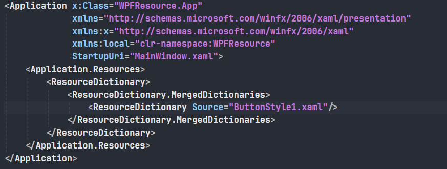 这个时候还得在加载时将这个资源词典加载过来,在app.xaml中加载
