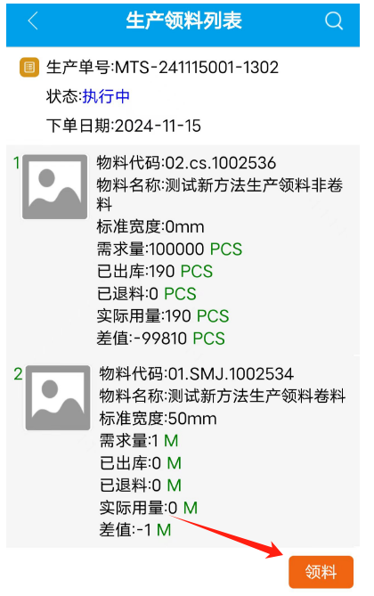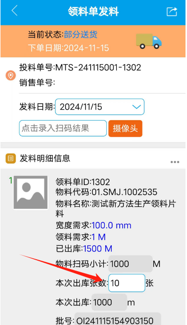 ![]() 选择单一工单发料进入 如下图: 选择某工单点击领料按钮进入 如下图: 修改下面张数,要多少放多少 如下图: 最后点击发料 如下图: