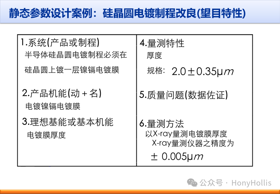 在当今竞争激烈的市场环境中,企业不断追求卓越的质量和高效的生产。田口 DOE 法(静态参数)作为一种强大的质量管理工具,为企业提供了实现这一目标的有效途径。 一、田口 DOE 法是由质量管理大师田口博士创立,其在国际上久负盛名,曾在日本质量管理学院任职,为众多知名企业提供咨询顾问服务。他开发的田口方法,是一套源于全面质量管制与保证观点的方法,用于缩短制程改善与产品开发周期。 二、田口 DOE 法通过对系统理想机能的思考、误差因素的应用以及 SN 比的衡量,能够在产品研发设计和制程改善中发挥重要作用。它能帮助企业找出设计或制程的最佳条件组合,使变异最小化,从而提升产品质量。 三、该方法的核心特色包括:一是着重 “系统理想机能” 思考,明确系统应达到的最佳表现;二是充分考虑 “误差因素”,如外部杂音、内部杂音和产品间的变异,通过控制、补偿或减小杂音冲击来应对;三是以 SN 比衡量质量,追求信号与噪声比的最大化,确保系统输出的稳定性和可靠性。 四、田口 DOE 法还涉及一系列关键要素,如控制因素、信号因素、误差因素等,以及多种质量类型和系统输出种类。通过合理选择因素和配置实验,如运用直交表设计,能够高效地获取数据并进行分析。 五、在实际应用中,以硅晶圆电镀制程改良为例,田口 DOE 法能够显著提升产品质量。通过明确系统、选取因素、配置实验、收集分析数据等步骤,确定最适条件,从而大幅降低变异,提高生产效率和产品质量。这一方法为企业在质量管理和优化方面提供了宝贵的思路和方法,助力企业在市场竞争中脱颖而出。 以下便是关于田口DOE法的相关资料: