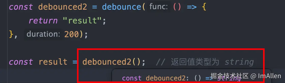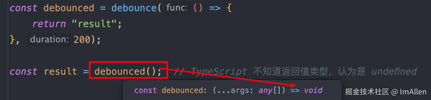 typescript 代码解读 复制代码const debounced = debounce (() => { return "result" ; }, 200 ); const result = debounced (); // 返回值为 string console .log (result); // 输出 "result"