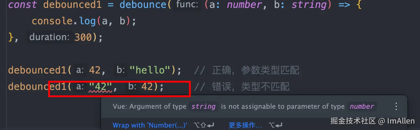 typescript 代码解读 复制代码const debounced1 = debounce ((a: number , b: string ) => { console .log (a, b); }, 300 ); debounced1 (42 , "hello" ); // 正确,参数类型匹配 debounced1 ("42" , 42 ); // 错误,类型不匹配